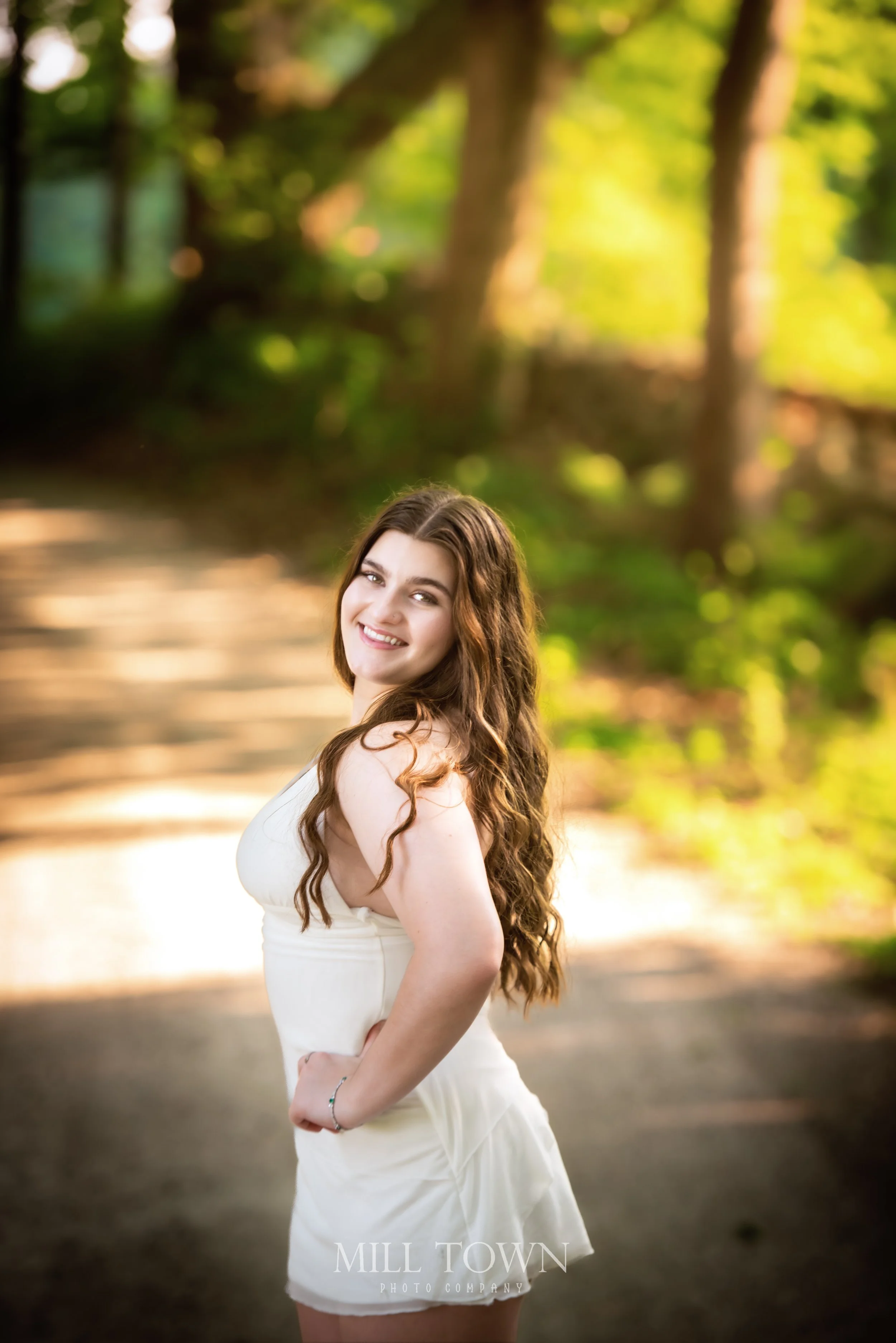 From there, we switched gears into something softer—her crisp white dress against the dappled light of the trees. The way she laughed over her shoulder in those shots felt effortless, like the kind of smile only summer evenings can bring out.